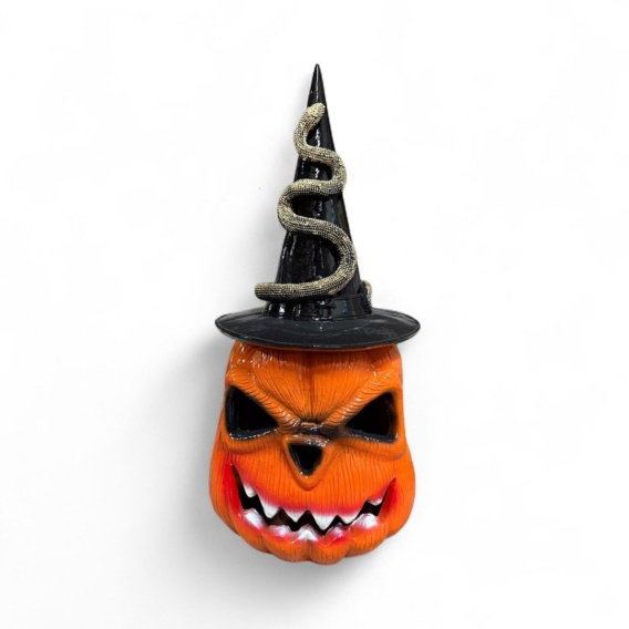 Ta urocza dynia w zabawnym kapeluszu to nie tylko dekoracja – to także lampion, który po umieszczeniu świeczki LED lub tealightu rozświetli wnętrze ciepłym, nastrojowym światłem.